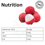 تتمتع الليتشي بمظهر غذائي جيد جدًا لأنها تحتوي على كمية قليلة جدًا من الدهون وغنية جدًا بفيتامين سي ويحتوي الليتشي علي 66 سعر حراري لكل 100 جرام ودهون صحية 0.44 جرام و 16.53 جرام من الكربوهيدرات و 0.83 جرام بروتين